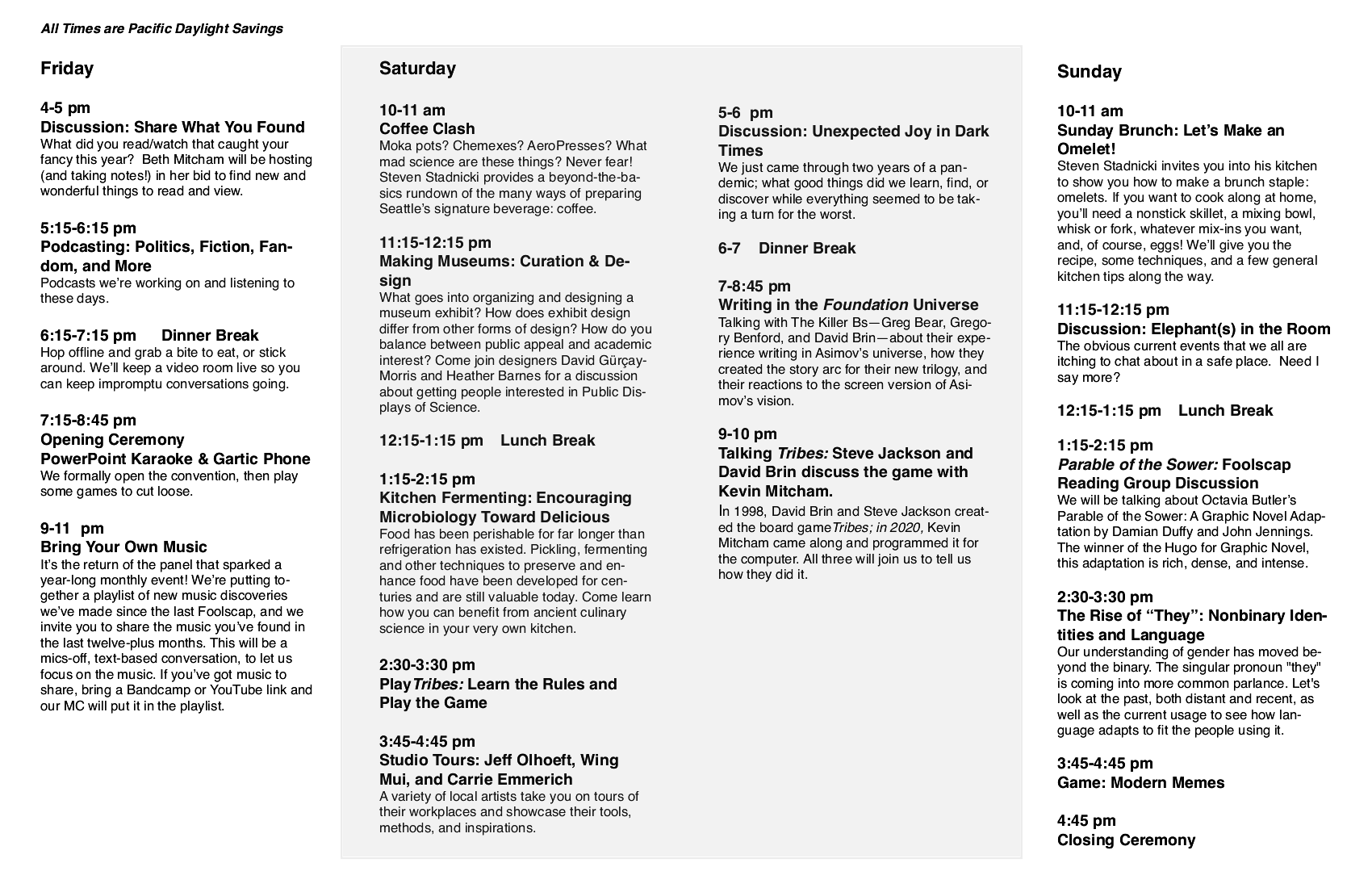 It’s the return of the panel that sparked a year-long monthly event! We’re putting together a playlist of new music discoveries we’ve made since the last Foolscap, and we invite you to share the music you’ve found in the last twelve-plus months. This will be a mics-off, text-based conversation, to let us focus on the music. If you’ve got music to share, bring a Bandcamp or YouTube link and our MC will put it in the playlist.